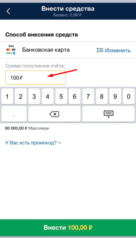 №4 – указать сумму пополнения и тапнуть по зеленой кнопке «Внести».
