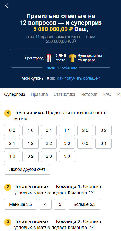 Один из таких – суперприз в Марафон Бет. Достаточно открыть страницу акции и ответить на 12 вопросов (оставить прогноз). Выигрыш будет 5 миллионов рублей, а в случае лишь одной ошибки – 250 тысяч.