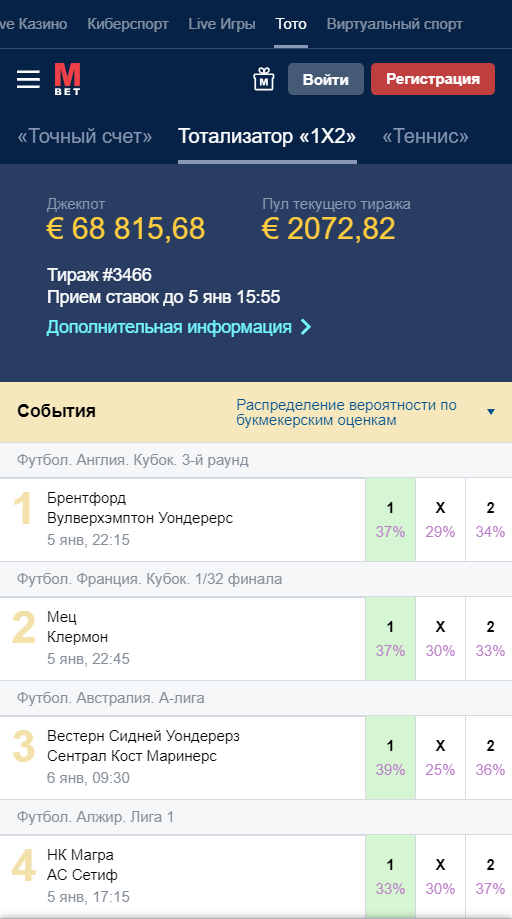 Игра на тотализаторе заметно отличается от обычных ставок на спорт. В нем букмекер, получающий фиксированную прибыль, выступает в статусе гаранта, а соревнуются между собой претенденты на выигрыш. В данном сервисе необходимо использовать совсем другой подход, не полагаясь только на аналитику и статистику. С течением времени приобретается необходимый опыт. Клиенты БК Марафон, имеющие неплохой процент угадывания исходов и точного счета в одиночных ставках, могут претендовать также на солидные заработки, используя суперэкспрессы. Стоит признать, что добиться позитивного результата без особой подготовки будет крайне сложно, хотя и бытует мнение, что везет новичкам.